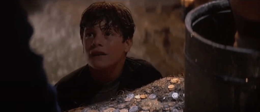 Although thematically and diegetically relevant, the kids are faced with death several times throughout the film. By “faced with death”, I don’t just mean they are in danger of dying suddenly – I also mean they stumble upon a lot of dead bodies. Chunk, in an unwitting pursuit of ice cream, gets stuck in the Fratelli’s freezer with a deceased FBI agent, supposedly murdered by the Fratellis. (Then again when he’s thrown in the back of their jeep.) When they finally board the treasure-loaded pirate ship, the gang finds themselves surrounded by the remains of pirates who have long since expired. There’s even a poignant moment between Mikey and the rotting skeleton of One-Eyed Willy. (Not to mention Chester Copperpot, the skeleton at the organ made of other human bones…) As annoying as the whole “which generation had it tougher” discourse is, I do have to hand it to Gen X/elder Millennials here: one of your most beloved childhood movies involved kids running into an upsettingly high number of corpses. Although, as is popularly said in the movie, “Goonies never say die”, they sure do see a lot of it.